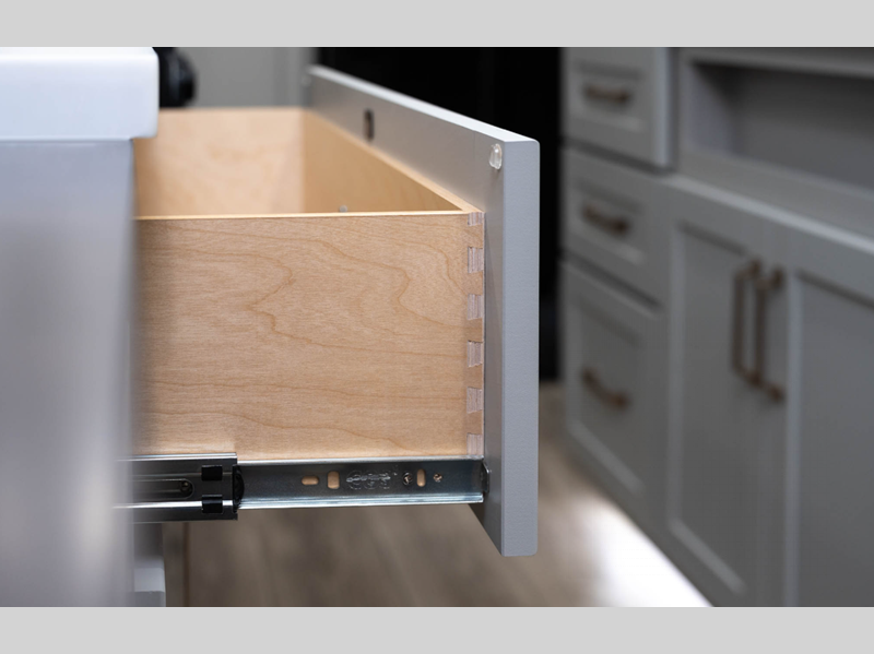 The drop frame chassis will provide a smooth tow from home to campground, and the one-touch automatic leveling system will have you set up in no time. You will love the sleek styling with automotive-grade exterior graphics, along with the square Euro frameless windows with 6" openings. Inside, there are premium residential cabinet and drawers, solid surface countertops, Brinkley's CraftSense wood trim construction, and many more premium features.