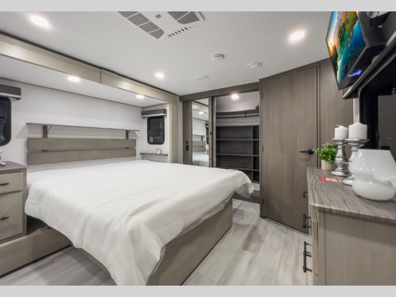 Sleeps 3 Slides 3 Length 35 ft 11 in Ext Width 8 ft 5 in Ext Height 13 ft 5 in Int Height 8 ft 5 in Hitch Weight 2500 lbs GVWR 18000 lbs Dry Weight 12712 lbs Fresh Water Capacity 81 gals Grey Water Capacity 106 gals Black Water Capacity 53 gals Tire Size ST215/75R17.5 LRH Furnace BTU 35000 btu Available Beds Queen Refrigerator Type 12 Volt Refrigerator Size 16 cu ft Cooktop Burners 3 Shower Size 30" x 48" Number of Awnings 2 Axle Weight 7000 lbs LP Tank Capacity 30 Water Heater Type Tankless AC BTU 15000 btu TV Info LR 50" LED Smart TV, BR LED TV Awning Info 18' & 11' Power w/LED Lighting Axle Count 2 Washer/Dryer Available Yes Number of LP Tanks 2 Shower Type Standard Electrical Service 50 amp Solar Wattage 330 watts Similar Floorplans