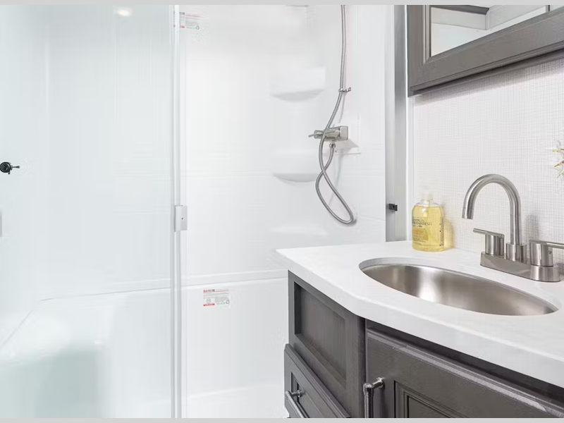 You'll be met with residential features inside, such as solid surface kitchen countertops, hardwood cabinet doors, dimmable lights in select areas, and more. The Climate Guard Protection Package will help extend your camping season so you can travel in colder months, and there are added safety features for your peace of mind.