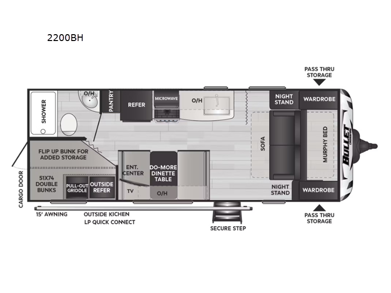 Added sleeping space and a versatile Murphy bed are a dream come true in this cozy travel trailer. The double-size bunks include a flip-up bunk for added storage, and the front Murphy bed can be folded away in the morning so you can relax on the sofa. There is also a Do-More dinette table where you can dine, play games, and sleep more guests. This model includes a full bath to clean up in each day, and there is a pantry just outside the bath for clean towels and necessities or for snacks. And check out the exterior with its 15' power awning with LED lights, pass-through storage, and outdoor kitchen with a pull-out griddle and refrigerator.